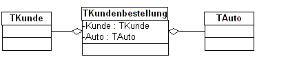 Beispiel: Der Motor ist Teil eines Autos Motor als komplexes Objekt wird dem Autoobjekt hinzugefügt (aggregiert) und damit zu einem Attribut von TAuto. Es wird daher als eingebundenes Komponentenobjekt bezeichnet. Im Normalfall ist ein Auto erst dann fertig, wenn der Motor eingebaut ist, d. h. der Motor muss beim Erzeugen des Autos automatisch miterzeugt werden. Beim Verschrotten wird der Motor mit verschrottet. 2.1.2 Die einfache Aggregation