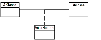 (Kurznotation in UML) In der Verfeinerung wird man die Link-Klasse einführen, die dann leider wiederum zwei Beziehungen mit den Ausgangsklassen hat, die unterschiedlich gestaltet werden können. Für die