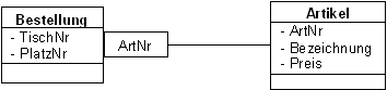 eingesetzt wird. Qualifizierte Assoziation Bei Objekten, die Beziehungen zu einer Sammlung von Objekten haben (Artikelliste) lässt sich eine Assoziation auch dadurch aufbauen, dass die Referenz auf ein qualifizierendes Attribut (Schlüssel) zeigt. Beispiel: Einem flotten Kellner genügt es, wenn er die Artikelnummer aus der Speisekarte in die Bestellung aufnimmt.