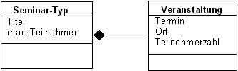 a) Beschreibungen Es gibt Attributwerte (Titel, max. T.), die zu einer Menge von Exemplaren gehören. Diese werden in der Aggregat-Klasse gespeichert, die Einzelheiten (speziellen Attr.) bleiben in der Teile-Klasse. b) Registrierung von Ereignissen Für ein Exemplar einer Klasse sollen bestimmte Ereignisse festgehalten werden, z. B. wann ein Mitarbeiter anwesend ist, wie lange usw. Wegen der engen semantischen Beziehung werden diese Attribute mit der Teil-Klasse aggregiert. |