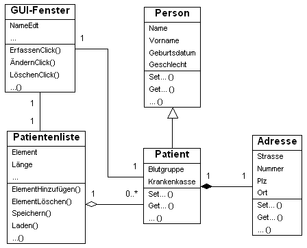 Die Notwendigkeit von Entwurfstätigkeiten verlangt, dass das OOA-Modell entsprechend angepasst wird. Nach der Idealvorstellung soll die OOA abgeschlossen sein, bevor Entwurfsüberlegungen angestellt werden. Aber wer kann das schon, wenn er nur die XYZ-Sprache zur Verfügung und verinnerlicht hat? Auf jeden Fall verstellt ein zu frühes Schielen auf die Designmöglichkeiten den Blick für ein geniales OOA-Modell. Beispiel: OOD - Modell Patientenverwaltung PAT 99 (vgl. OOA Modell) |