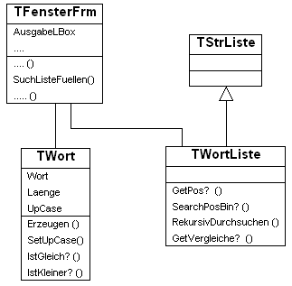 Zum Testen der Suchalgorithmen benutzten Sie das Programm Such99, das Sie aus dem Gruppenordner kopieren. Das Programm ist voll funktionstüchtig bis auf die fehlende Suchmethode. Das Bild zeigt die statische Struktur.