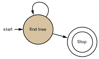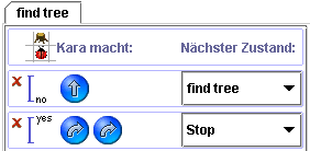 Kara und Automaten – Kara’s Programmierung Kara wird programmiert, indem ein Automat erstellt wird. Als Beispiel wird ein einfaches Programm geschrieben, das Kara bis zum nächsten Baumstumpf führt und dort um 180° dreht. Die Abbildung zeigt eine mögliche Situation. Die erste Frage beim Entwurf eines Automaten ist immer, welche Zustände brauche ich? Hier lautet die Antwort: einen Zustand "suche Baum" und einen Zustand "STOP". Im Zustand "suche Baum" soll Kara solange verweilen, bis er einen Baum gefunden hat. Dann soll er in den Zustand "STOP" gehen. Dieser Zustand existiert in jedem Automaten, der für Kara erstellt wird! Aus ihm gibt es keine Übergänge. Wenn er erreicht ist, hört Kara mit der Programmausführung auf. Für den Zustand "suche Baum" stellt sich die Frage, welche Sensoren braucht Kara in diesem Zustand? Der Einfachheit halber kann der Benutzer bei Kara auswählen, welche Sensoren in welchem Zustand relevant sind. Alle anderen werden einfach ignoriert. Für "suche Baum" braucht es nur den Sensor "tree in front?" Nach der Auswahl der Sensoren für den Zustand "suche Baum" kommen die Übergänge an die Reihe. Mit den Sensoren erkundet Kara seine Umwelt. Sie sind gleichermassen die Fragen, die er an seine Umgebung stellt: "Stehe ich vor einem Baum?" Je nachdem, wie die Antwort auf diese Frage ausfällt, muss Kara sich anders verhalten. "Verhalten" heisst, vorgegebene Befehle ausführen und in einen Zustand übergehen. In unserem Beispiel: Wenn Kara noch nicht vor einem Baum steht, kann er einen Schritt nach vorne tun und im Zustand "suche Baum" verharren. Steht er aber vor einem Baum, vollzieht er die 180° Drehung und geht in den Zustand "STOP" über. Damit ist die Aufgabe erfüllt und das Programm beendet. Die Abbildung zeigt, wie das Programm in Kara’s Entwicklungsumgebung aussieht. Die Tabelle muss zeilenweise gelesen werden. Die oberste Zeile ist nur Beschriftung. Ganz links in ihr sind die Sensoren abgebildet, die für diesen Zustand ausgewählt wurden. Diese Sensoren sind die "Fragen". Die erste Spalte gibt in der restlichen Tabelle an, für welche Sensorwerte der Rest der Zeile ausgeführt wird. Anders gesagt, bei welchen "Antworten" der Übergang gewählt wird. Der Übergang ist in der zweiten und dritten Spalte beschrieben. Er gibt die Befehle an, die Kara auszuführen hat, und den Zustand, in den Kara nach der Ausführung der Befehle übergehen soll. Jeder Zustand ist eine Reihe von "wenn-dann"-Anweisungen an Kara. Die Tabelle ist zu lesen als: