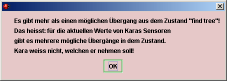 Das ist das ganze Programm! Es ist unabhängig davon, wo und mit welcher Himmelsrichtung Kara gestartet wird. Kara ist es egal, ob er horizontal oder vertikal läuft. Allerdings terminiert das Programm natürlich nur dann, wenn Kara zu Beginn geradeaus auf Bäume sieht! Hätten wir einen Logikfehler im Programm wie zum Beispiel zweimal die Antwort "yes", dann würde Kara während der Programmausführung darauf hinweisen. Er bleibt stehen, wo er gerade ist und zeigt die entsprechende Fehlermeldung an. Im Programmierfenster sieht man den Zustand, in dem der Fehler aufgetreten ist. So hilft Kara den Schüler/innen, Logikfehler in ihren Programmen zu beseitigen. Vor und Nachteile der variablenfreien Programmierumgebung "Kara" ( aus dem Seminar "Analyse, Planung, Beurteilung von Informatikunterricht", HU-Berlin unter der Leitung von Herrn Penon, 3.6.2002) Das Programmieren mit Kara hat gegenüber anderen Programmierumgebungen gewisse Vorteile, aber auch erhebliche Nachteile. Diese Programmierumgebung ist sehr einfach und somit fast intuitiv, selbsterforschend zu erlernen und eignet sich somit als Einführung in die Programmierung in der Oberstufe. Die Schüler können sich durch bloßes ausprobieren Schritt für Schritt an die Lösung der Aufgaben herantasten. Dieses erweist sich aber als nicht ökonomisch, da die Modellierung auf einem Stück Papier vorzustrukturieren ist, bei komplexen Aufgaben viel schneller bzw. nur so im vorgegebenen Zeitrahmen zum Ziel führt. Diese Erkenntnis hat mich verblüfft und diese Erfahrung den Schülern zu vermitteln halte ich für wertvoll und reizvoll. Die Modellierung oder die Umsetzung der Lösung des Problems mit den Mitteln des Programms steht eigentlich immer im Mittelpunkt, da die Befehle die zu dessen Lösung zur Verfügung stehen sehr eingeschränkt sind und dabei häufig umgedacht werden muss. Dieses führt meines Erachtens sogar dazu, dass Schüler mit Programmiererfahrungen in Pascal oder anderen höheren Sprachen den Anfängern gleich gestellt sind. Dieses liegt daran, weil eigentlich die Umsetzung der Logik im Vordergrund steht und nicht die Umsetzung des Problems in eine maschinenverständliche Form. Als Kontrollstrukturen gibt es nur die Fallunterscheidungen, die durch geschickte Verknüpfung zu Schleifen umgesetzt werden. Beim Umstieg auf eine höhere Programmiersprache kann immer wieder auf Kara zurückgegriffen und es kann überlegt werden, wie dieses in Kara umgesetzt wurde. Die Notation von Kara hat eine von Grund auf verschiedene Notation von allen mir bekannten Programmiersprachen, da Zustandsgrafiken in einen Algorithmus umgesetzt werden. Diese führt zwangsläufig zu einem Umdenken. Dieses führt zu einem Zeitnachteil, den man sich vom Stundenplan her leisten können muss! Ein Vorteil ist, dass die Schüler bereits innerhalb relativ kurzer Zeit eine eigenständige Programmierumgebung kennengelernt haben und der Lehrer immer wieder auf Kara zurückgreifen kann, um dieses da zu erklären. (z. B Unterschied einer Fallunterscheidung (IF-Anweisung ) von einer vorprüfenden (WHILE-Schleife). Dabei muss man aber auch sehen, dass gewisse Probleme sich durch Kara nicht modellieren lassen. Hierzu sei die Nachprüfende Schleife erwähnt. Die Programmierumgebung "Kara" hat ihre Einschränkungen, denen sich Schüler und Lehrer bewusst sein müssen, aber die sich auch leicht durchschauen lassen. Es lassen sich zum Beispiel auch keine Befehlsfolgen zu einer Funktionseinheit zusammenfassen (PROCEDURE). Die Aufgaben die man mit Kara lösen kann, sind somit sehr eingeschränkt lösbar und komplexere Aufgabe lassen sich nur unter nicht zu vertretendem Aufwand bzw. nicht umsetzen. Man könnte Kara somit eine gewisse Realitätsfremdheit vorwerfen. Aber da muss man sich auf die Möglichkeiten besinnen und sich bewusst sein, dass Kara anfängertauglich ist und "man hoffentlich" damit in der Oberstufe einen guten Unterrichtseinstieg bilden kann. Im Folgenden sind diese und weitere Vor- und Nachteile tabellarisch dargestellt.